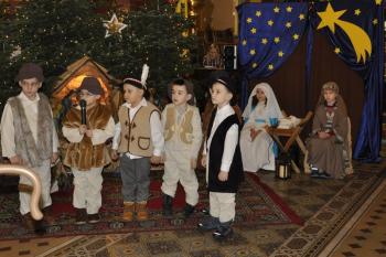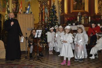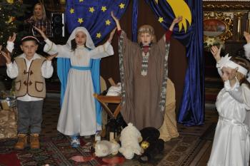 Korowód śpiewających kolędy parafian w symbolicznych koronach przeszedł śladem gwiazdy betlejemskiej do kościoła. Tutaj wierni złożyli sobie noworoczne życzenia, biorąc przykład z księdza Dewery i wójta Smolarka, którzy jako pierwsi połamali się opłatkiem. Kiedy już wszyscy zasiedli z powrotem w ławach, wnętrze włosienickiej świątyni stało się sceną, na której dzieci pod opieką nauczycielek miejscowego przedszkola odegrali misterium o narodzinach Króla królów. Na finał do wspólnego kolędowania zaprosiły zespoły "Dworzanki" i "Bratkowie" z Monowic wspierane przez parafialne grupy modlitewne.