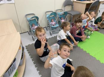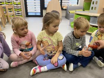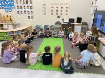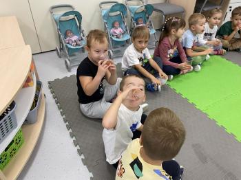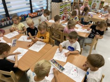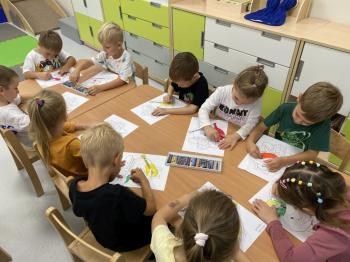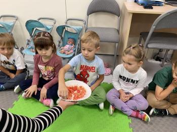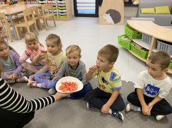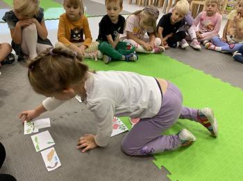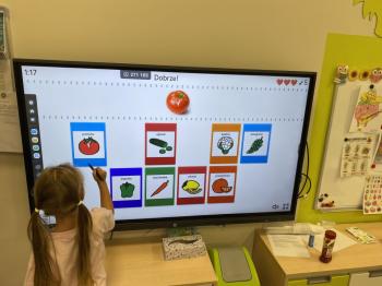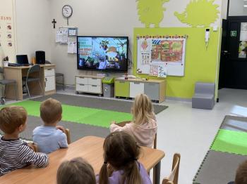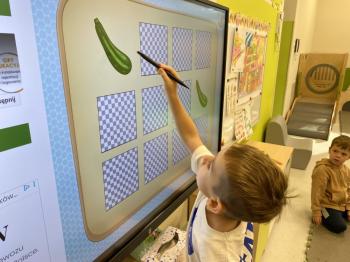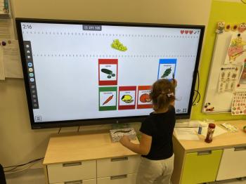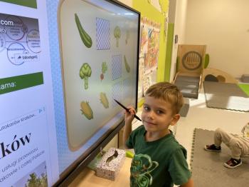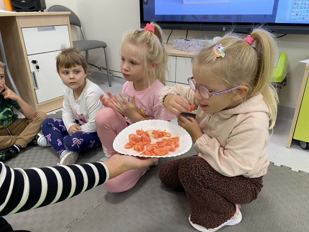 Podczas zajęć dzieci realizowały projekt „Witaminki” i poznały pierwsze warzywo – pomidora. Dowiedziały się, jak wygląda i smakuje pomidor, jakie ma odmiany, w jaki sposób się go sieje i pielęgnuje. Rozmawiały także o tym, jakie potrawy i przetwory można przygotować z pomidorów. Dzieci z radością uczestniczyły w grach edukacyjnych na tablicy multimedialnej oraz pokolorowali pierwszego poznanego bohatera.