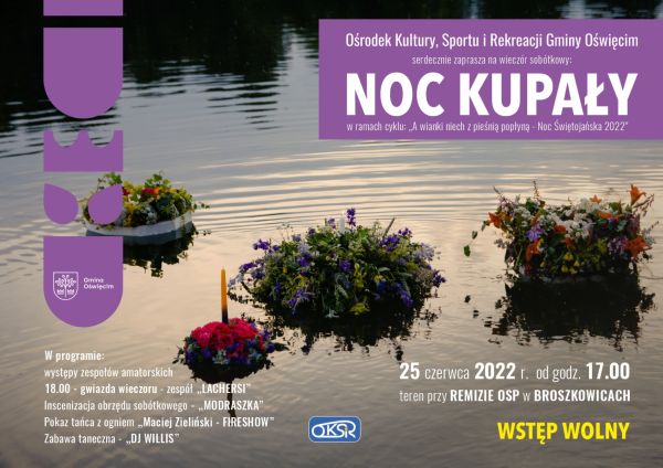 Kupalnocka odbedzie się 25 czerwca w Broszkowicach przy ul. Klubowej 7 na terenie Remizy OSP, od godz. 17:00. Wystąpią przed Państwem zespoły śpiewacze z gminy Oświęcim i gwiazda wieczoru - zespół "Lachersi". "Modraszka przedstawi krótką inscenizację obrzędu sobótkowego wraz z przemarszem i puszczeniem wianków na wodę. Po zapadnięciu zmroku zobaczymy pokaz tańca z ogniem, a później zabawa do rana przy muzyce.