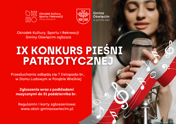 Już po raz dziewiąty Ośrodek Kultury, Sportu i Rekreacji Gminy Oświęcim zaprasza do wzięcia udziału w Konkursie Pieśni Patriotycznej.