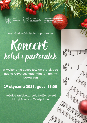 Serdecznie zapraszamy wszystkich na Koncert Kolęd i Pastorałek, który odbędzie się 19 stycznia 2025 roku o godzinie 16:00 w Kościele pw. Wniebowzięcia Najświętszej Maryi Panny w Oświęcimiu.
