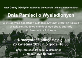Wójt Gminy Oświęcim Mirosław Smolarek zaprasza do wzięcia udziału w obchodach Dnia Pamięci o Wysiedlonych w 84. rocznicę deportacji ludności cywilnej Brzezinki i okolic w związku z budową niemieckiego obozu zagłady KL Auschwitz-Birkenau.