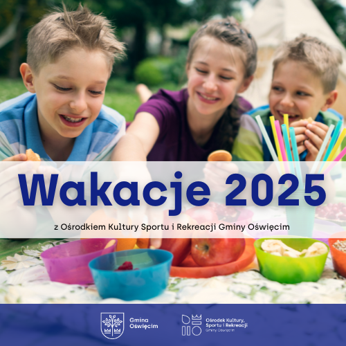 Zapraszamy dzieci z gminy Oświęcim w wieku szkolnym do udziału w zajęciach i wycieczkach w terminie 30.06 - 11.07.2025 w ramach Wakacji 2025 z Ośrodkiem Kultury, Sportu i Rekreacji Gminy Oświęcim.