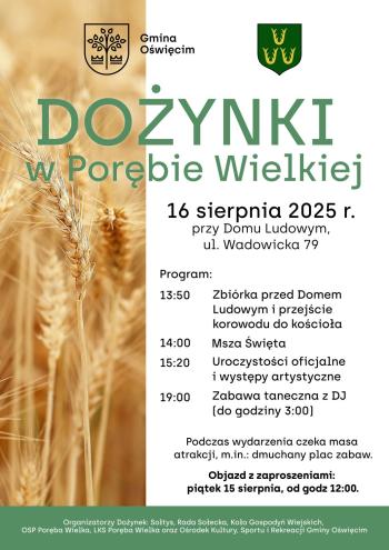 Serdecznie zapraszamy na obchody Święta Plonów już 16 sierpnia 2025 r. przy Domu Ludowym, ul. Wadowicka 79.